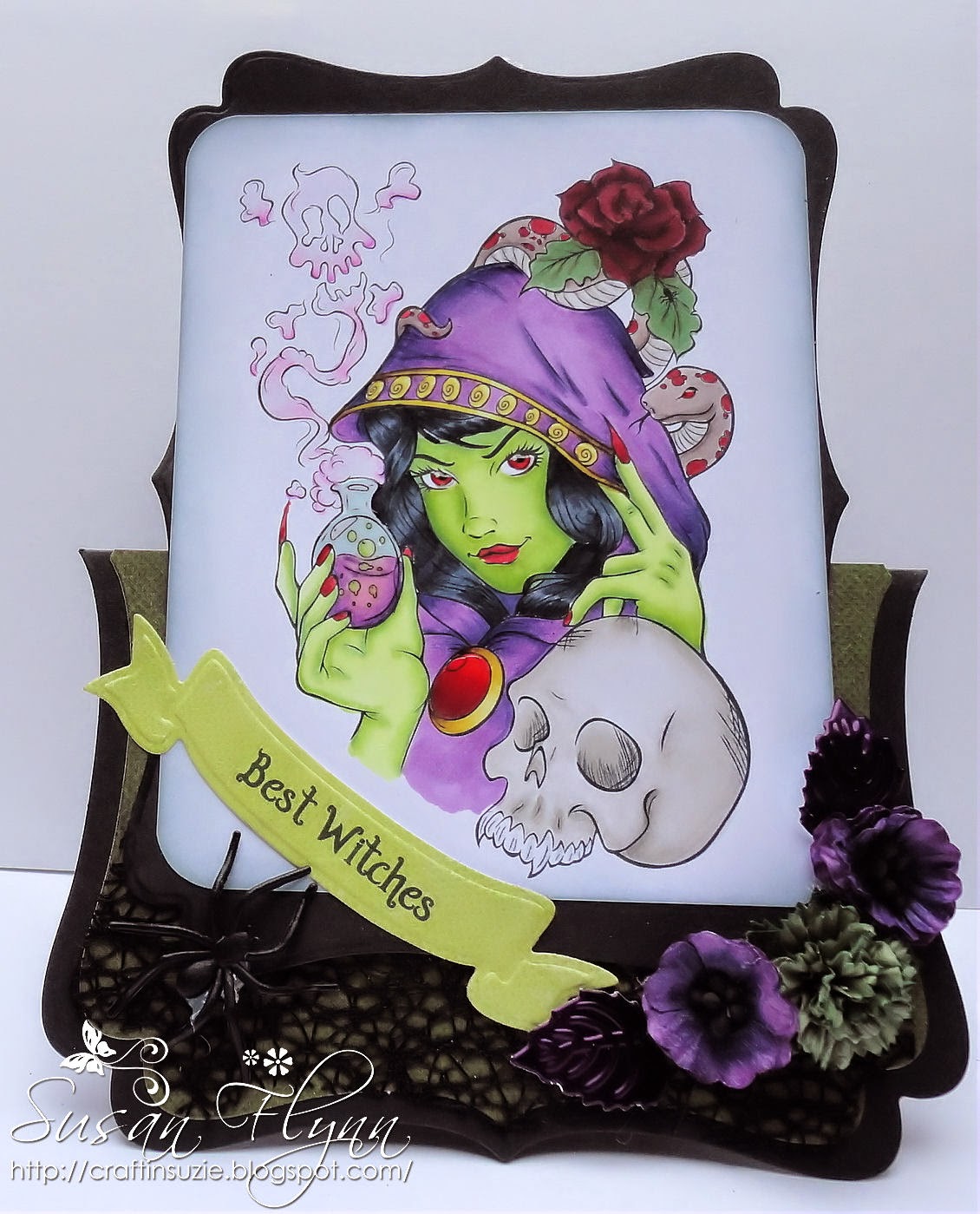 This beauty is called Witching Hour and lives here. I coloured her with my Copics and she took an age to colour! I added some Glossy Accents to the glass flask, brooch, her eyes and the snake's eyes. I used Go Kreate XL No 1 frames for the card shape and mat. The sentiment is computer generated and cut out using Spellbinders Ribbon Banners. The flowers are from Wild Orchid and I coloured the purple ones with my Copics. The paper you can just see is Basic Grey Marjolaine. I edged around the image with Weathered Wood DI and used a corner rounder punch on the corners. I also added some black webbed ribbon and a plastic spider from Home Bargains.